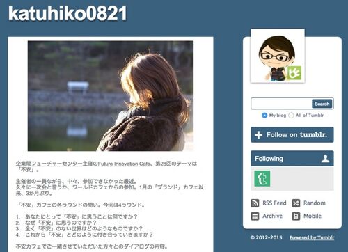 帰宅してメールチェックしたらTumblrからメッセージが届いていました。 「今日はkatuhiko0821の3周年記念です!!すばらしい年となったなら幸いです。これからもたくさん共有できますように!」 そして、3年ぶりくらいにTumblrを開いたら案の定投稿はほとんど皆…