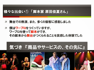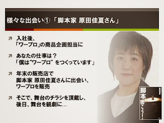 チャレンジしている彼らの姿を振り返りながら、自分の入社当時の貴重な経験も思い出していました。ワープロの商品企画担当だった当時に出会った脚本家 原田佳夏さん。原田さんとの出会いで学んだこと、それは「商品やサービスの、その先に」。当時、僕はワープロをつくっていましたが、ワープロを使って脚本ができ、その脚本から舞台がつくられることを実感した体験。あれから、もうじき20年。今でも鮮明に覚えている思い出。一生忘れない思い出。